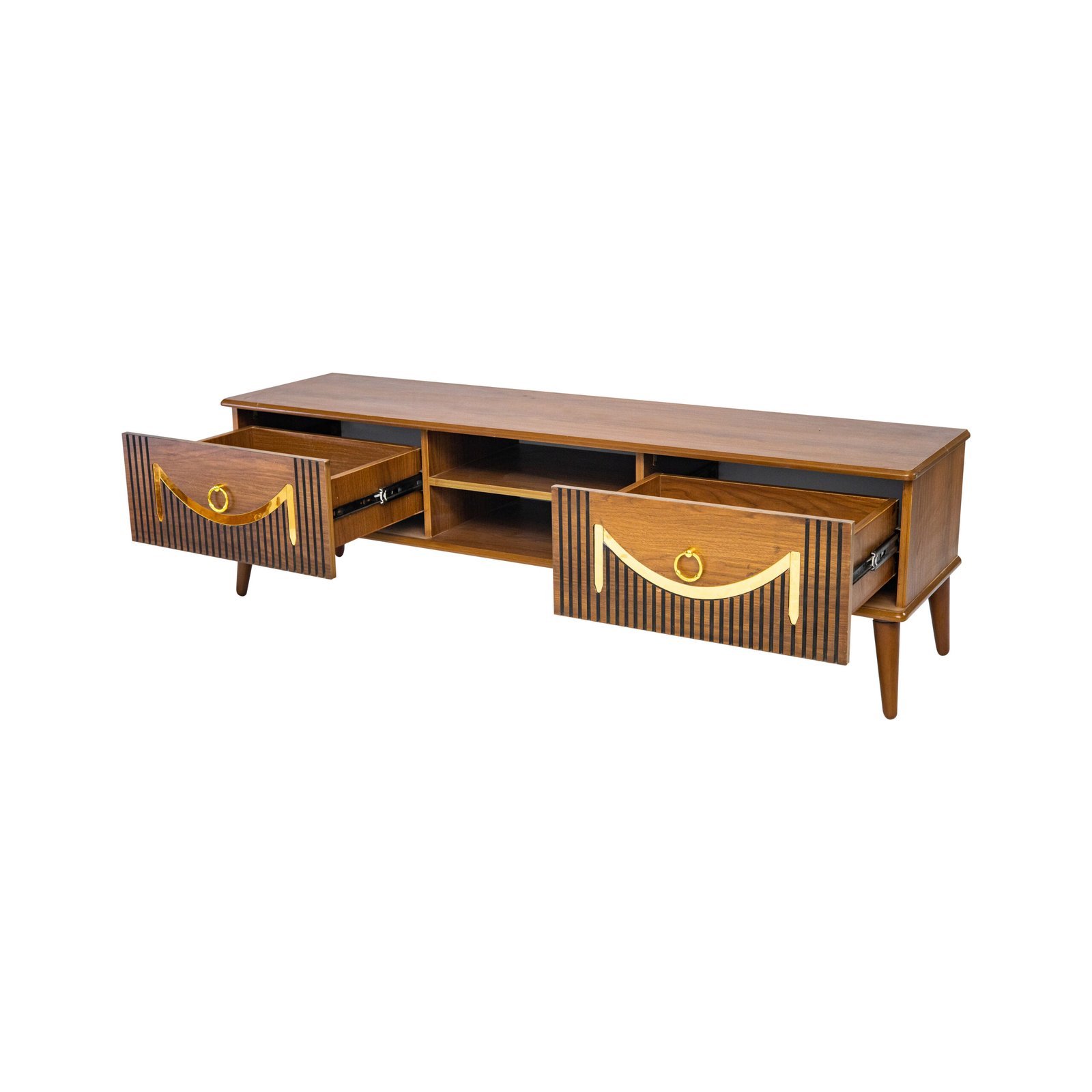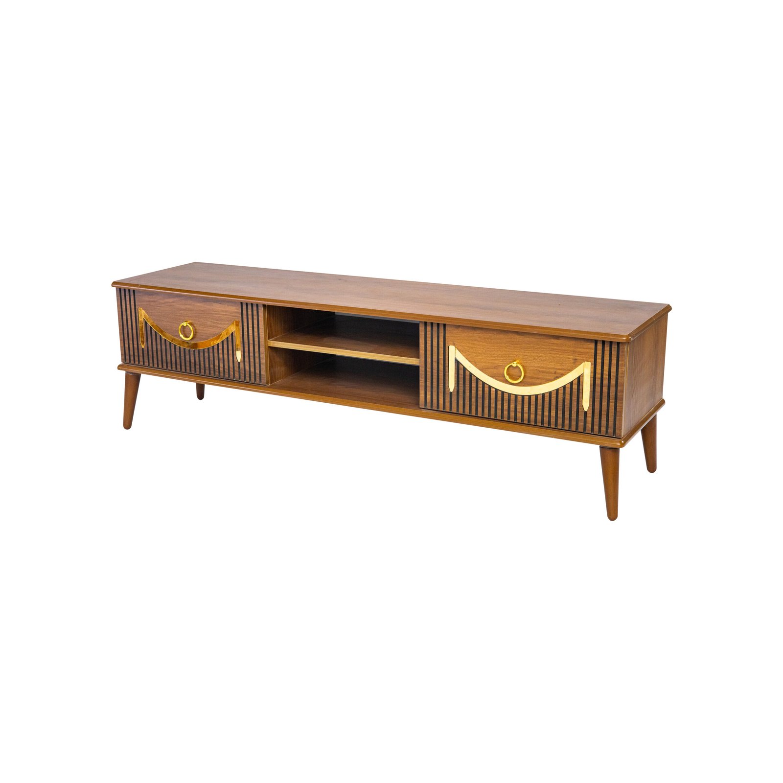 التصميم ده بيجمع بين الدفء الكلاسيكي للخشب وبين اللمسات العصرية بفضل الإكسسوارات الذهبية الأنيقة والخطوط الهندسية المنظمة. مش مجرد ترابيزة تليفزيون، دي قطعة ديكور متكاملة.
