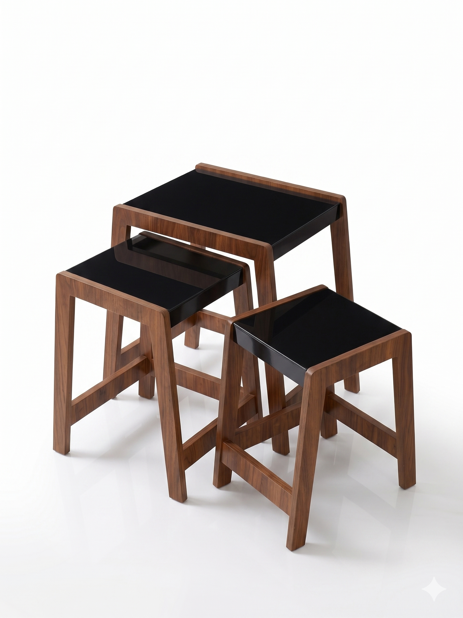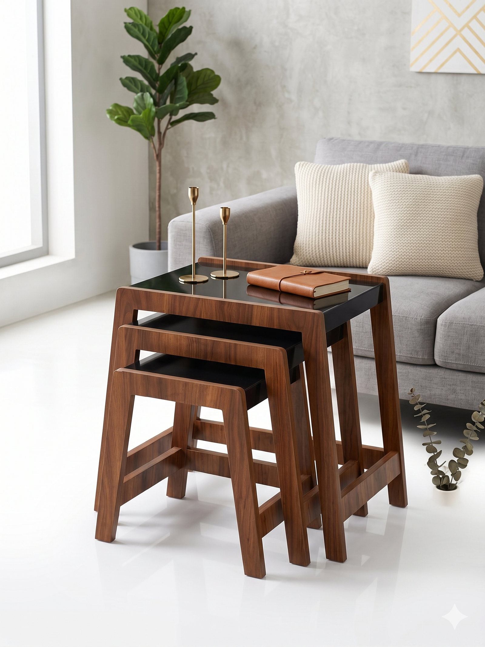 صممناها بعناية من أجود أنواع الخشب بلون الجوز الدافي، مع سطح بلمسة سوداء فخمة تخليها قطعة ديكور لوحدها. سواء محتاج تستخدمهم في ركن القهوة أو بجانب الصوفا، الطقم ده هو الحل الذكي اللي بيوفرلك مساحة من غير ما يضحي بالأناقة.